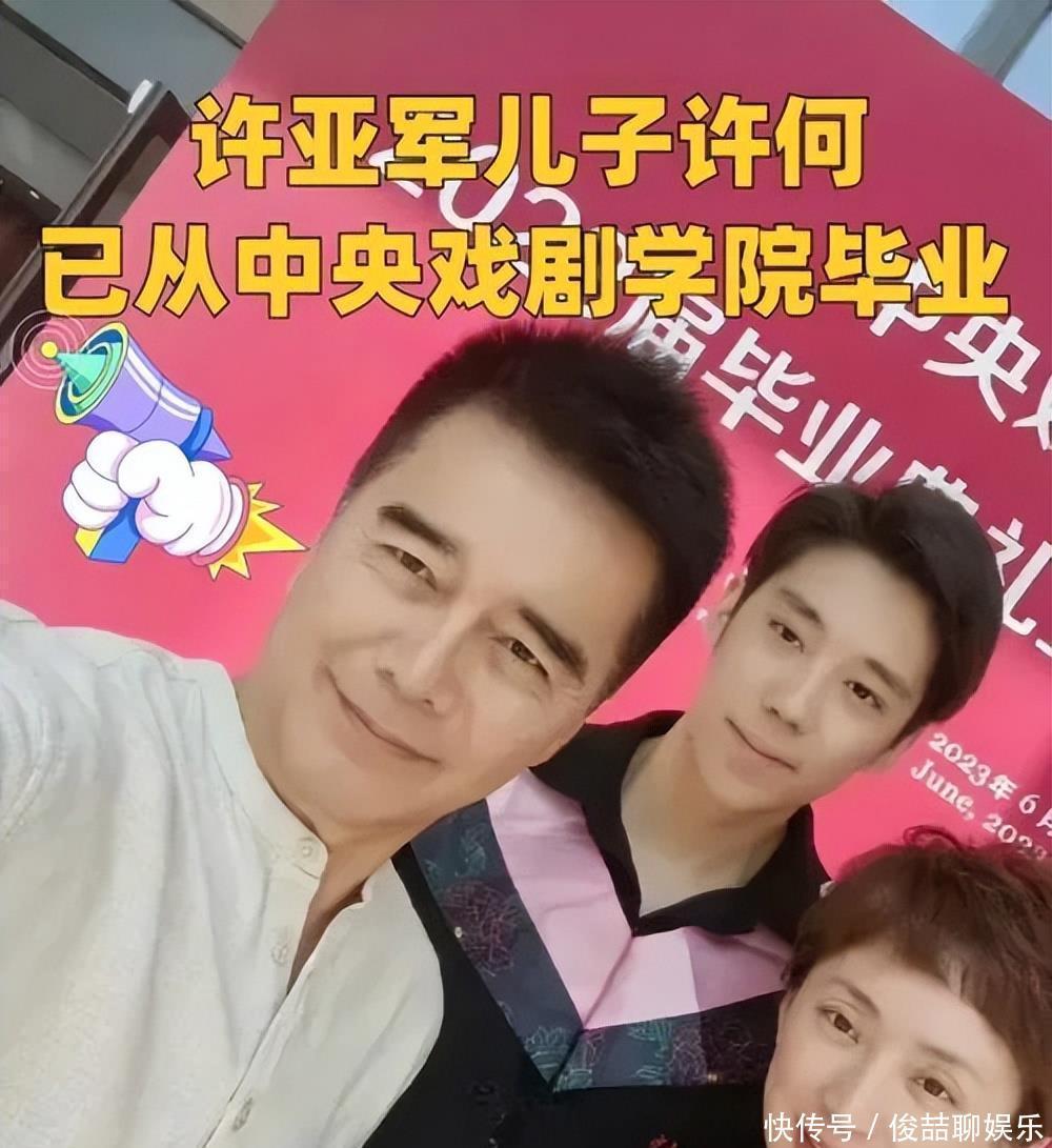 子承父业令人欣慰现在许何已经24岁了,继承了父母那份出众的长相优势,身高挺高,长得也挺帅气,还得到了父母的演技天赋。2019年,许何顺利进入中央戏剧学院表演系,还和父母成了校友。毕业那天,许亚军和张澍都到场了,三人还合照留念。